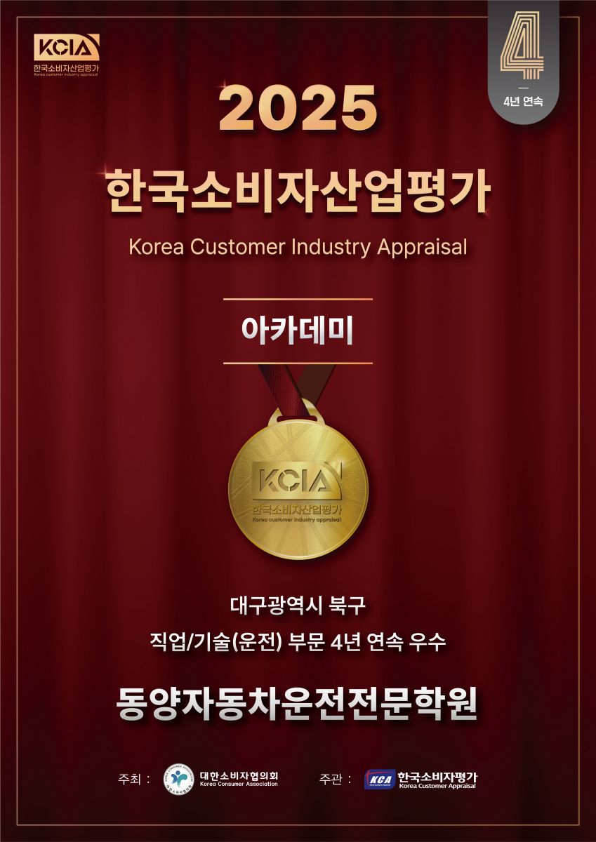소비자평가 우수 운전학원으로 2022,23,24년에 이어 2025년 "4년연속 선정"되었습니다.